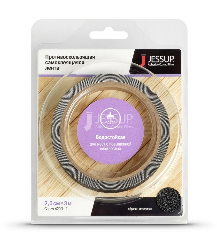 Jessup® Flex Track® 4200 Coarse - серия профессиональных противоскользящих неабразивных самоклеящихся полимерных материалов с сильно структурированной противоскользящей поверхностью в лентах с шириной 2,5 и 5,0 см. и длинной 3 метра в блистерной упаковке, разработанный для хождения босиком, в легкой и средней обуви.